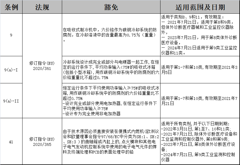 2020年3月5日,歐盟官方日志(Official Journal of the European Union)上發(fā)布了五項(xiàng)新指令,其中關(guān)于2011/65/EU的(表格一)修訂條款包括9,9(a)-I,9(a)-II,41;(表格二)的修訂條款為37,41,新增豁免條款44。